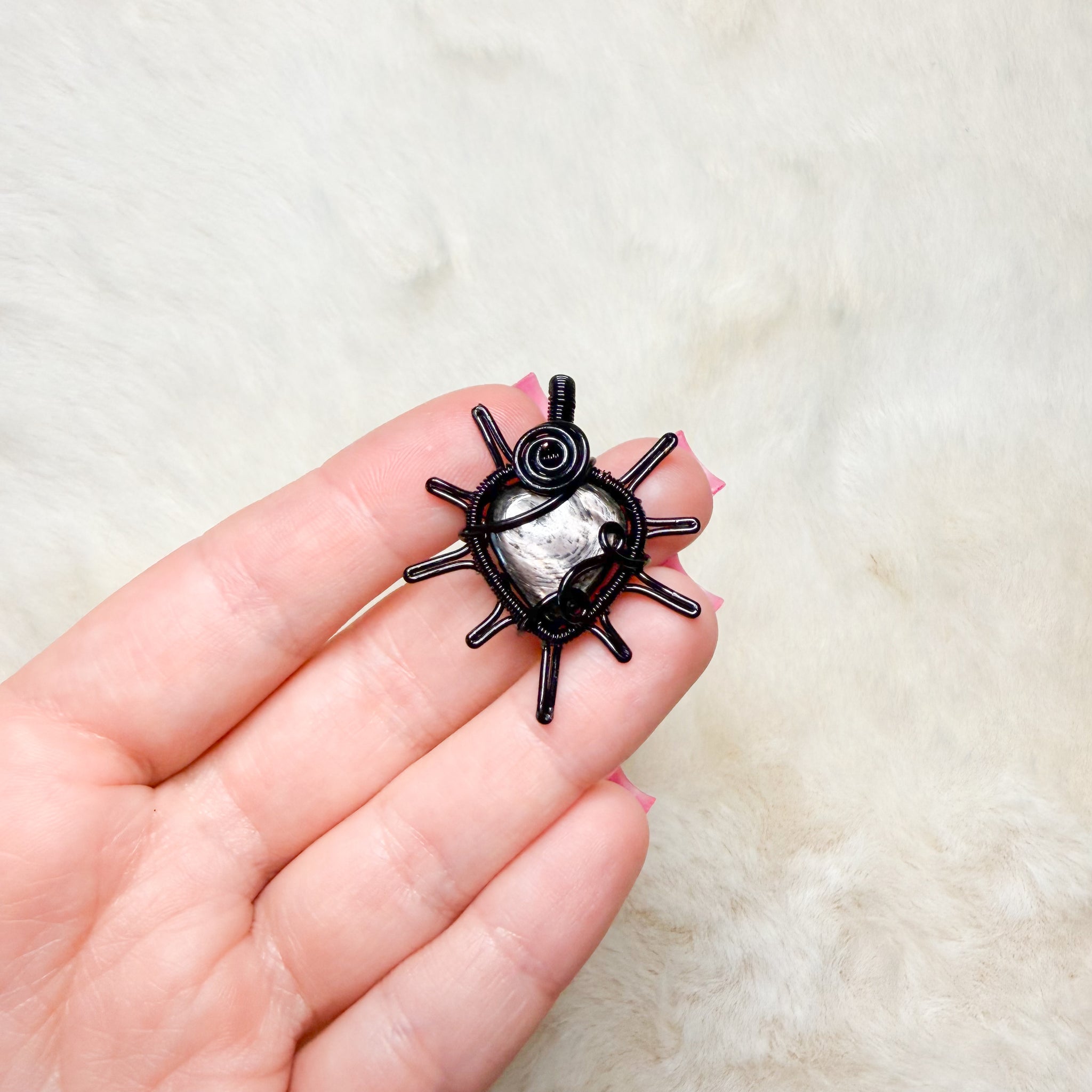 comes with black clasped cord for necklace. Silver/copper chains sold separately.