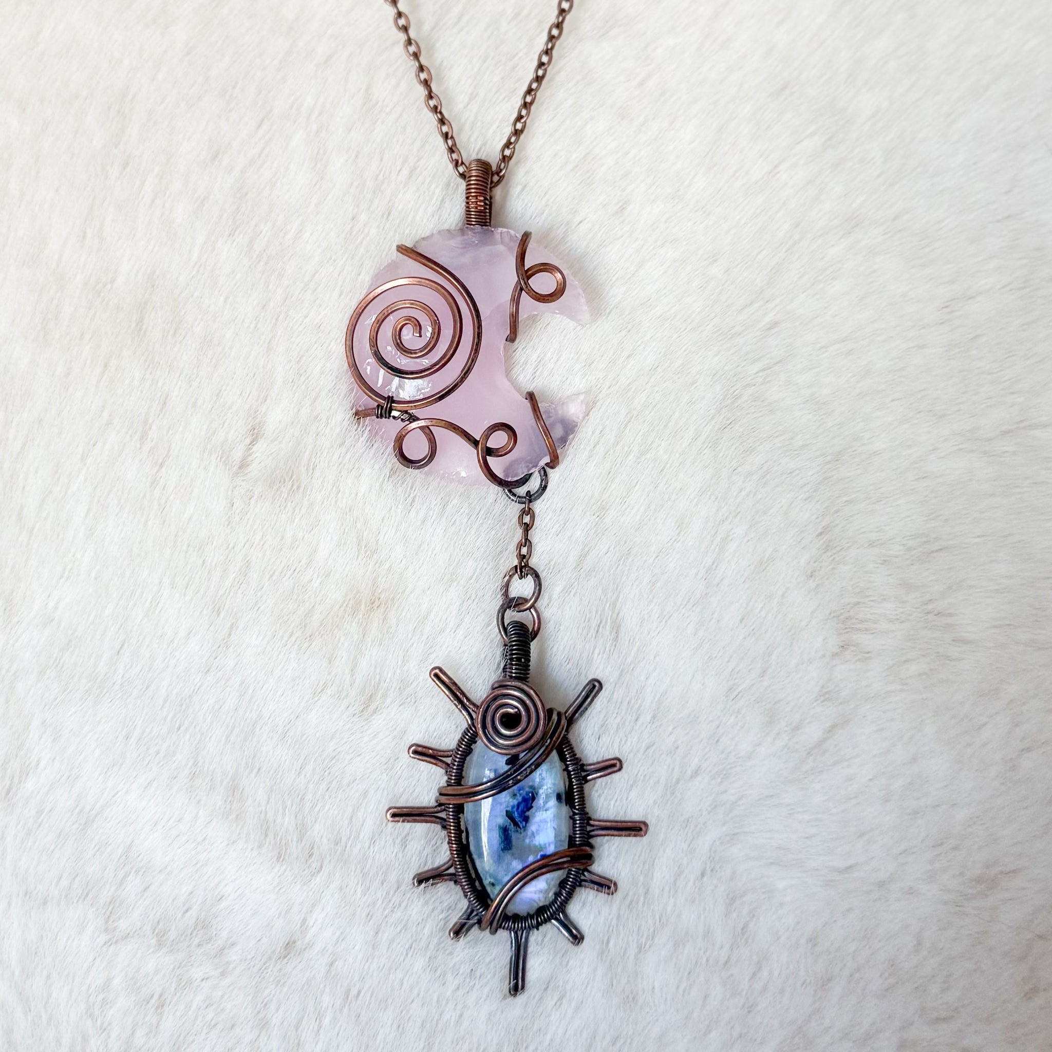 Rose Quartz Moon x Rainbow Moonstone Dangle Sun Pendant